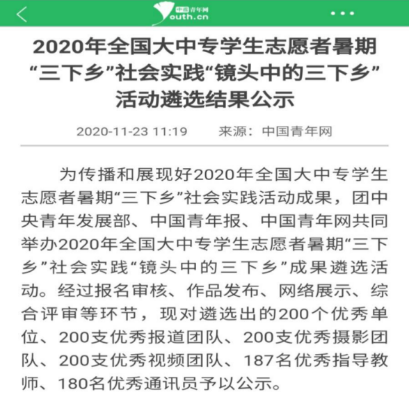 2020年团中央“镜头中的三下乡”成果遴选结果公示,银河国际在线登录“星火”实践团的参赛视频经层层筛选,最终脱颖而出,斩获“优秀视频奖”。此次获奖是继2018年、2019年后,银河国际在线登录“初心”系列暑期社会实践团第三次获得此殊荣。