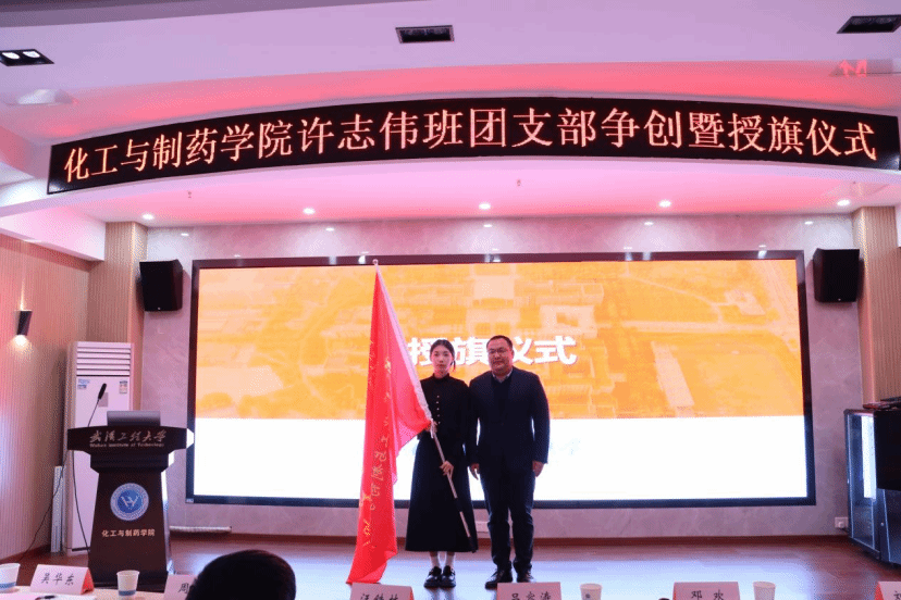 党委学工部部长吕容涛、校团委副书记邓欢、银河国际在线登录党委书记汪铁林为第二期许志伟班团支部授旗。