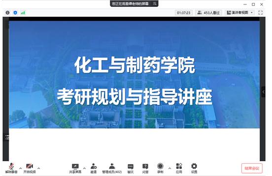 讲座主要围绕全国研究生入学考试形势分析、考研科目及分值分布、目标院校选择、考研备考复习规划等方面进行了阐述和讲解,对化工与制药类专业考研作了翔实的全程规划指导。
