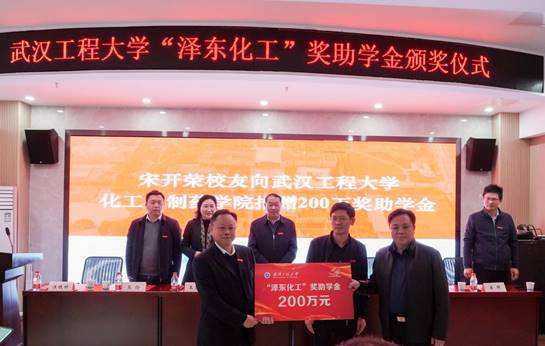 宋开荣向银河国际在线登录捐赠200万元设立“泽东化工”奖助学金,其中,本科奖学金每生8000元、研究生奖学金每生10000元、本科助学金每生5000元、研究生助学金每生10000元和就业奖金每生10000元。