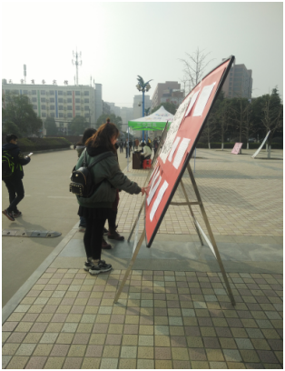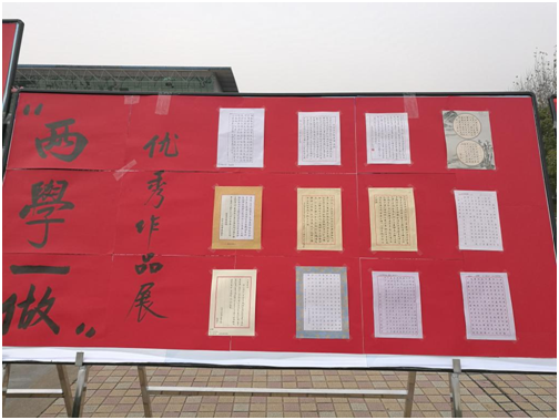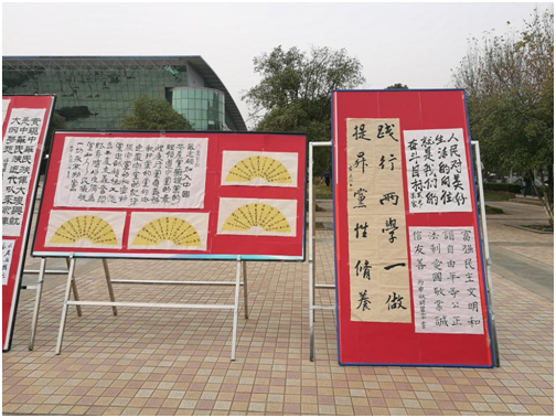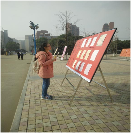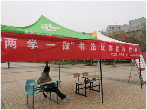 1130日和121日,“两学一做”书法大赛优秀作品在流芳校区大礼堂广场前进行了为期两天的摆点展览,此次展览吸引了全校师生的众多关注。