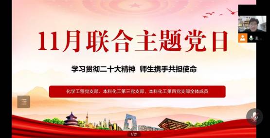 本网讯(通讯员 常琬笛)11月24日下午,银河国际在线登录化学工程教师党支部、本科化工第三、第四党支部联合开展线上主题党日活动,师生党员共学共进,联学联建,在学校抗击疫情的特殊时期密切联系师生,凝聚党员力量。