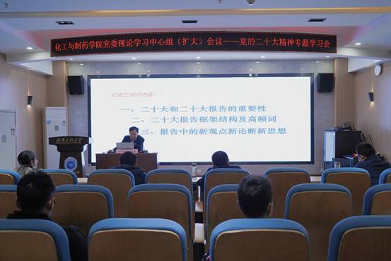 本网讯(通讯员 常琬笛)11月1日上午,银河国际在线登录在化工大楼610会议室召开党委理论学习中心组(扩大)会议暨党的二十大精神专题学习会,会议邀请学校马克思主义学院党委书记舒先林教授作宣讲报告。学院领导班子成员,全体党支部书记、副书记,专职组织员,党外知识分子代表参加了集中学习,会议由学院党委书记汪铁林主持。