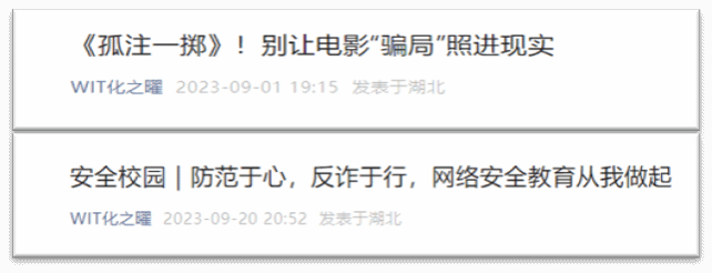 开学以来,学院认真响应湖北省教育厅、湖北省地方金融监督管理局《关于开展防范非法校园贷和电信网络诈骗教育的提示》和银河国际在线登录关心下一代委员会《关于开展“大学生国防、安全、心理健康教育” 公益大讲堂活动的通知》的号召,广泛宣传反诈知识和积极动员学生参与创作反诈网络文化作品,发布网络安全、反诈教育相关推文,引导全院学生学习“星空班会——五个电话(2023版)”和“小心 ‘炸弹’ —— 校园版 ‘孤注一掷’ ”网络小课堂,收到学习截屏540余张,公益大讲堂线上课程累计观看7300余次,组织召开线下主题教育班会40余场,收取以班级为单位的学习心得40余份,激励学生拍摄反诈相关情景剧作品9部,其中,《防诈超重要》反诈宣传视频在抖音播放量达4.3万。
