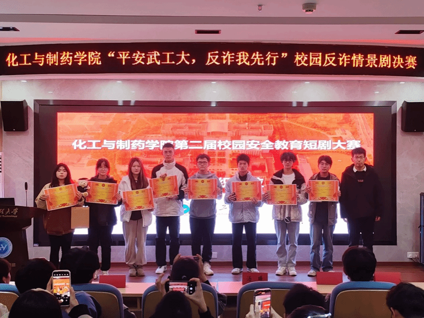 参与现场演出的班级共5个,其中2023级中外2班的《骗无可逃》获得一等奖,2023级化工2班的《孤注一掷武工大版》、2023级中外3班的《购物陷阱》和2023级能化1班《七夕的秘密》获得二等奖,2021级药剂2班的《AI 拟声,以假乱真》获得三等奖。2023级化工1班、2023级能化2班、2023级中外1班、2023级化工5班等四部网络作品同获三等奖。周开瑞等21人荣获“反诈教育课堂”优秀组织个人。