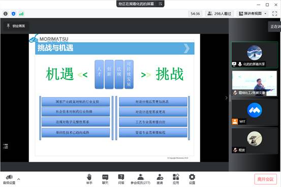 本网讯(通讯员 汤曦)5月5日下午,由学校招生与就业工作处主办,银河国际在线登录承办的职业经理人行业讲座在流芳校区化工大楼610报告厅和腾讯会议室同步举行。上海森松制药设备工程有限公司武汉分公司总经理黄胜受邀作“化工与制药相关专业如何适应国家智能制造产业升级”的主题报告,学院党委副书记周丹、院长助理刘根炎出席会议,学院教师樊庆春、350余名学生代表参加会议,会议由19级辅导员汤曦主持。