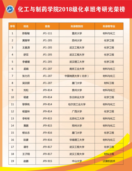 回望大学生活,考研至哈尔滨工业大学的黎季帆最难忘的就是与室友一起并肩作战的日子,他所在的宿舍JF9-814的4人全部考研上岸,“早上我们都是互相叫着起床,我们在一起复习,一起吃饭,回宿舍后也会讨论专业课问题及英语单词,平淡枯燥的日子,因为有了他们,变得更加有生机、有力量。大家同舟共济,也成为了学院8个全员上岸宿舍之一。最终,化卓班考研的21名同学中19人一战成“硕”。