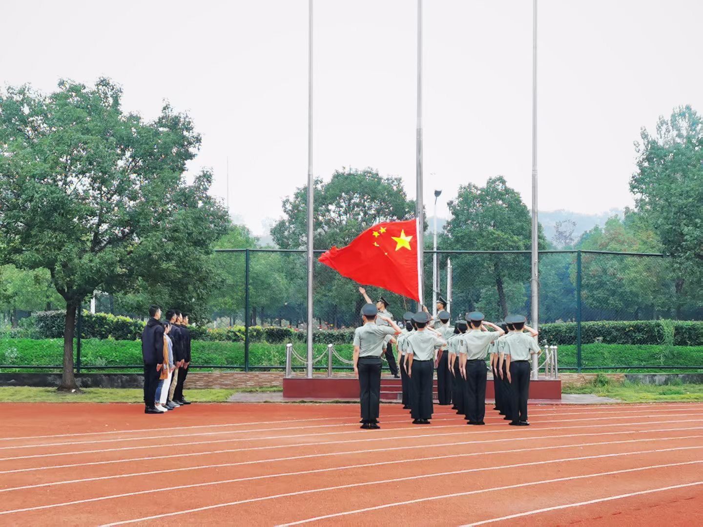 国歌雄壮,步履铿锵。国旗护卫队护送着鲜艳的五星红旗正步走向旗杆。在《义勇军进行曲》的音乐声中,升旗手迎风振臂,五星红旗在师生的瞩目与敬意中冉冉升起。