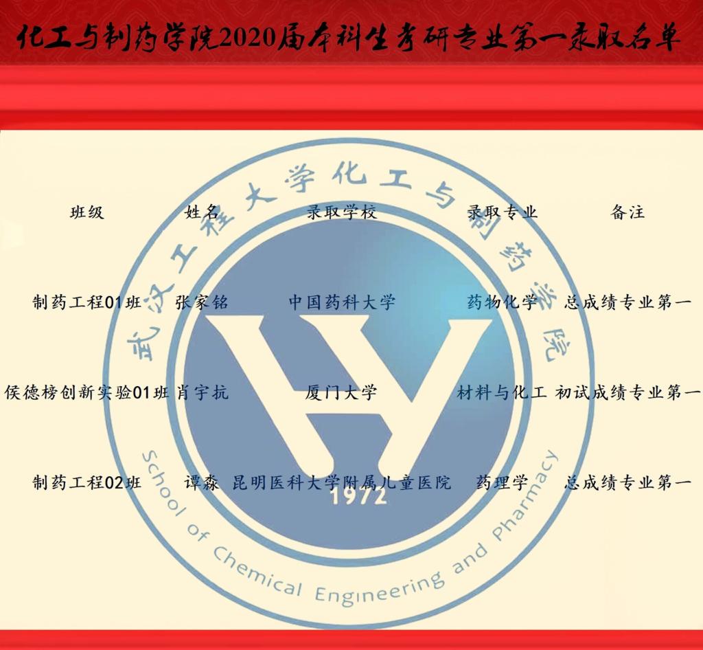 此次研究生考试中,高分考生频现,制药工程01班学习委员张家铭以专业总分第一名被中国药科大学录取;侯德榜创新实验01班,肖宇抗以材料与化工专业初试总分406分,专业第一名的成绩被厦门大学录取;制药工程02班谭淼以专业第一的成绩被昆明医科大学录取。