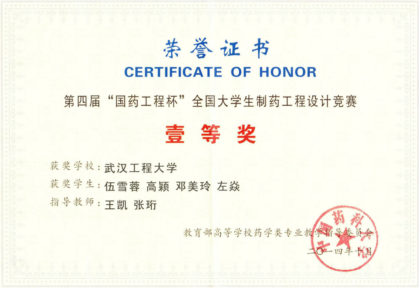 第四届“国药工程杯”全国大学生制药工程设计竞赛,由教育部高等学校药学类专业教学指导委员会主办、中国医药集团联合工程有限公司协办,沈阳药科大学承办。本次竞赛的题目为“多功能原料药车间工艺设计”,并设置一等奖5项、二等奖10项、三等奖20项、优胜奖25项。来自全国119份作品经过初赛评审,最终评选出选取了15份作品进入全国总决赛,并于2014年10月25-26日在沈阳药科大学举行。