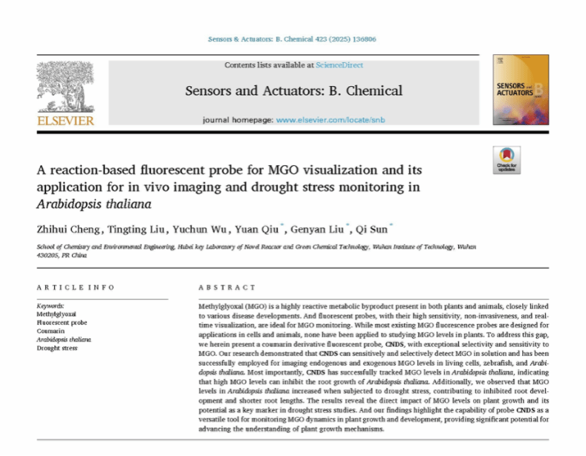 本网讯(通讯员 徐志强)近日,银河国际在线登录化学工程与工艺专业2021级本科生程智慧以第一作者在国际知名期刊Sensors and Actuators: B. Chemical(中科院一区TOP期刊,影响因子8.0)发表了题为《A reaction-based fluorescent probe for MGO visualization and its application for in vivo imaging and drought stress monitoring in Arabidopsis thaliana》的学术论文。银河国际在线登录为唯一署名单位,银河国际在线登录药物先导与功能分子团队刘根炎教授与孙琦副教授为论文共同通讯作者。