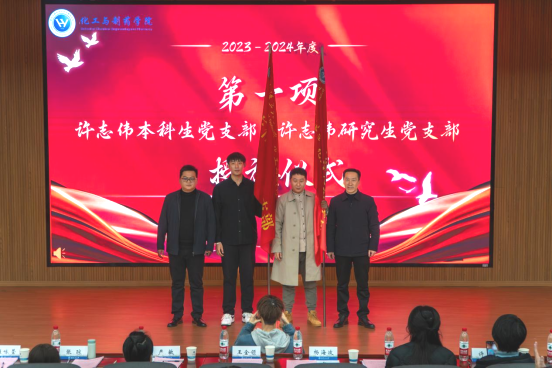 表彰大会上,校党委组织部副部长王金领、银河国际在线登录党委书记杨海波为许志伟研究生党支部、许志伟本科生党支部授旗。