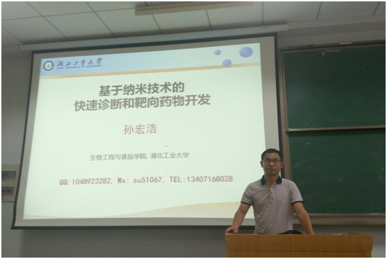 5月18日下午,湖北工业大学孙宏浩教授应邀在流芳校区四教学楼L4104教室为银河国际在线登录学生做了主题为“基于纳米技术的快速诊断和靶向药物开发”的学术报告。报告会由刘生鹏院长主持,银河国际在线登录部分师生共计50余人聆听了报告。