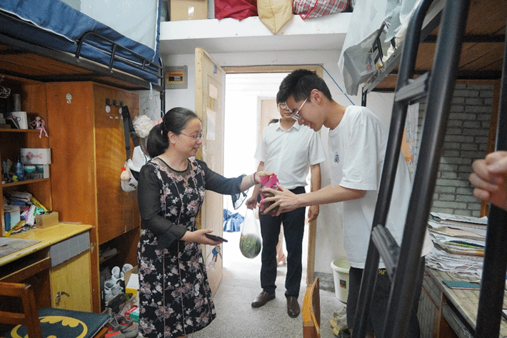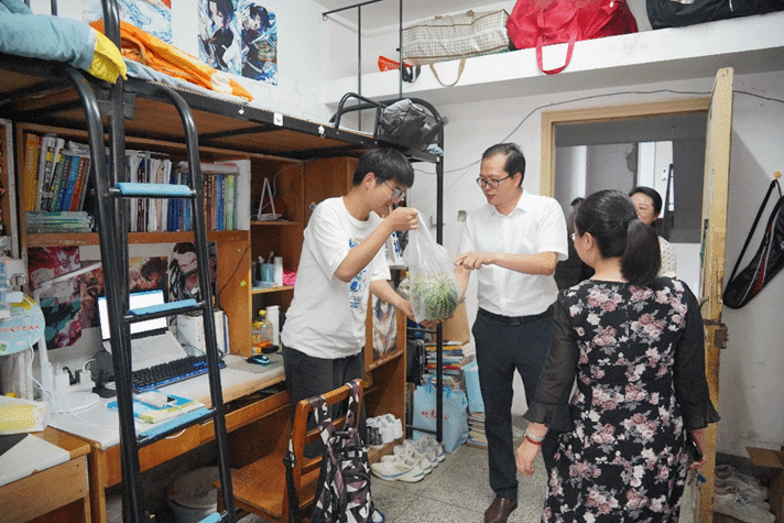 走访调研过程中,老师们每到一间宿舍,都与同学们进行了亲切的交流,当听到宿舍的同学们学习成绩名列前茅,老师们为同学们伸出了称赞的大拇指,同时鼓励同学们要努力提升自己专业水平,练就过硬本领,树立人生奋斗目标。值此端午节来临之际,老师们贴心的为同学们送去粽子和西瓜等慰问物资,并送上端午节的祝福,师生脉脉温情和阵阵笑声在寝室中流淌。